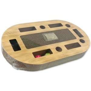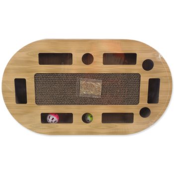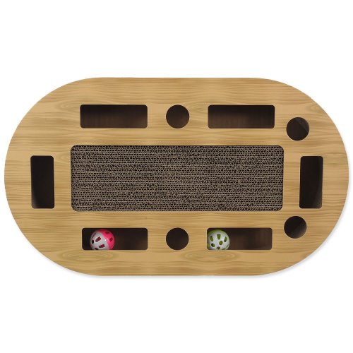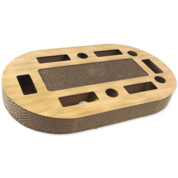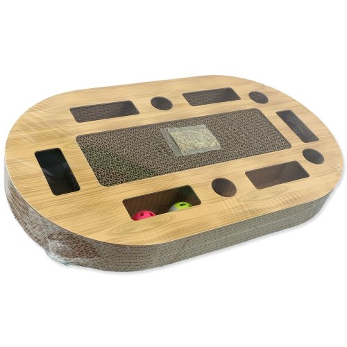 Interaktívne kartónové škrabadlo pre mačky so šantou, farebné prevedenie vo vzore dub.