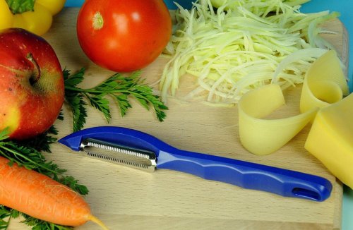 Stranová škrabka s pílkovým ostrím pre pravú aj ľavú ruku. Olúpe zemiaky, jablká, kivy, paradajky, mrkva, chren, nakrájate aj kapustu na prílohy.