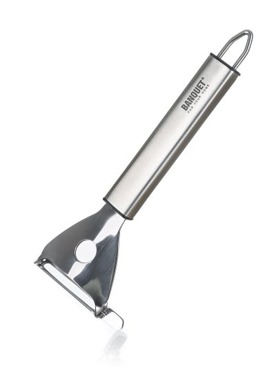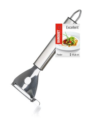 Škrabka s priečnou čepeľou EXCELLENT na lúpanie rôznych druhov ovocia a zeleniny. Škrabka je vyrobená z nerezovej ocele a má praktické držadlo s očkom pre možnosť závesu.