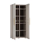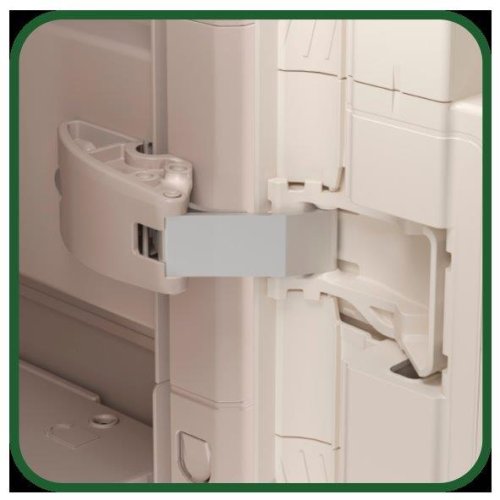 V prípade potreby skriňu uzamknete pomocou visiaceho zámku (nie je súčasťou balenia). Táto skriňa navyše odolá vode a vďaka spevnenému dnu a tyčke, ktorá vystužuje každú policu , je konštrukcia stabilná a bezpečná aj pri väčšom zaťažení.