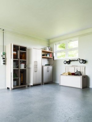 Skriňa Keter Gulliver Utility ponúka jedinečné riešenie pre uskladnenie väčších alebo objemnejších predmetov vďaka systému sklopných políc . Robustná konštrukcia je odolná voči vode (IPX3) a UV žiareniu, čo z nej robí spoľahlivého pomocníka do garáže, dielne, záhradného domčeka aj na terasu.