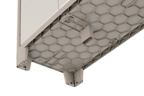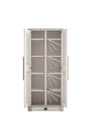 Skriňa je vyrobená z odolného plastu, ktorý chráni UV vrstva proti predčasnému starnutiu materiálu. Ochrana IPX3 zaistí bezpečné použitie aj vo vlhšom prostredí. Dvere sú vybavené systémom Assisted Opening System (AOS) , ktorý podporuje ľahké a pevné zatváranie. Stabilitu zaisťuje piata noha a možnosť uzamknutia skrine dodáva na bezpečnosti.