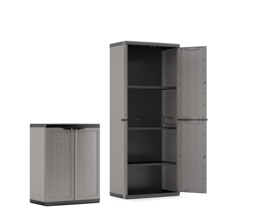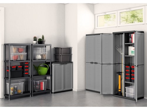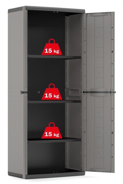Hľadáte odolnú, ľahkú a ľahko zostaviteľnú skriňu? Keter Jolly High talianskej výroby vás poteší jednoduchou montážou bez náradia , možnosťou uzamknutia visiacim zámkom a nastaviteľnými policami , ktoré unesú až 15 kg každá. Plastová skriňa Keter Jolly High je praktické úložné riešenie do dielne, pivnice aj domácnosti.