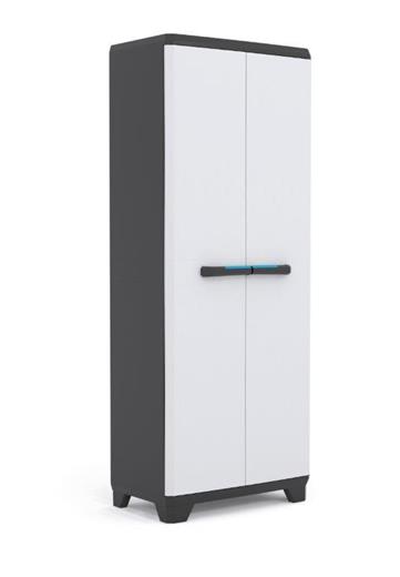 Skriňa je vyrobená z kvalitného plastu, ktorý je pevný, ľahký a odolný . Vďaka trom výškovo nastaviteľným policam si interiér ľahko prispôsobíte podľa veľkosti ukladaných predmetov. Modré ergonomické úchyty umiestnené na strede dverí zaisťujú pohodlné otváranie aj pri plnom zaťažení.