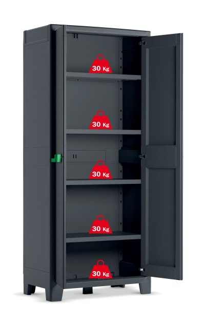 Skriňa obsahuje celkom 4 prídavné police - každá s nosnosťou až 30 kg , ktoré prídu vhod pre výrazne ťažšie predmety všetkého druhu. Možno ju teda využiť na skladovanie dielenského náradia či záhradníckych potrieb , kedy príde vhod na uloženie náčinia s dlhou násadou, ktoré by sa inam nezmestilo.