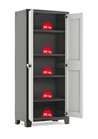 Skriňa obsahuje celkom 4 prídavné police - každá s výraznou nosnosťou až 30 kg . Hodí sa teda na skladovanie aj výrazne ťažších predmetov. Môžete využiť aj jej zosilnené dno, ktoré unesie rovnakú váhu ako polica. Uskladnite do nej dielenské náradie, záhradnícke potreby, pomôcky a prostriedky na upratovanie či pranie alebo na poličky vyskladajte zavareniny (marmelády, kompóty, pyré). Výšku poličiek si navyše zvolíte podľa veľkosti uložených predmetov.