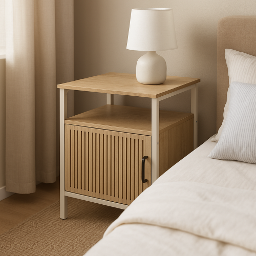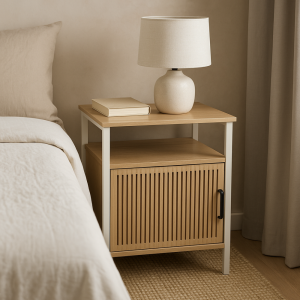 Praktická skrinka s krémovo bielym kovovým rámom , vybavená bielymi MDF policami a dverami z prírodnej MDF dyhy , vhodná pre štýlové uloženie drobných predmetov.