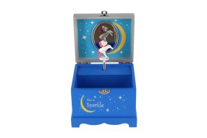 Táto hracia šperkovnica bude ideálnym miestom na uloženie pokladov každého dievčaťa. Šperkovnica je vyrobená z dreva, má krásnu modrú farbu a je zdobená hviezdami a motívom jednorožca, čo z nej robí ideálny doplnok pre detskú izbu. Pod krytom so zrkadlom je priestor na organizovanie suvenírov alebo šperkov. Tiež tu je bielo-ružový jednorožec, ktorý sa po natiahnutí kľúča točí a hrá. Rozmer šperkovnice: 12,5x12,5x10cm Nie je hračka