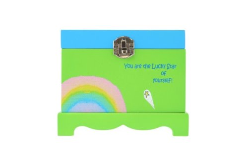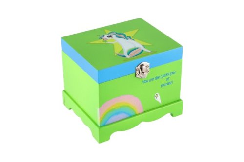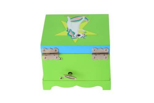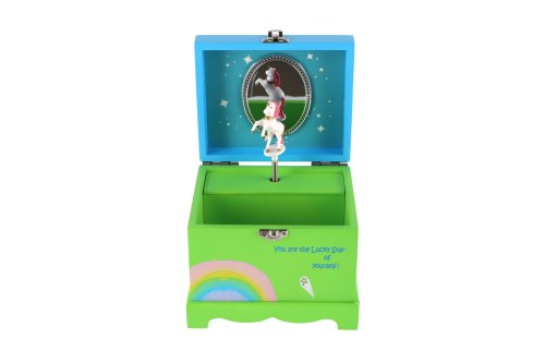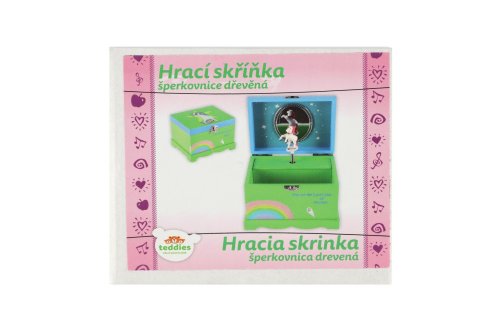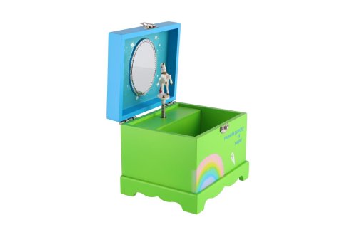 Táto hracia šperkovnica bude ideálnym miestom na uloženie pokladov každého dievčaťa. Šperkovnica je vyrobená z dreva, má krásnu zelenú farbu a je zdobená hviezdou a motívom jednorožca, čo z nej robí ideálny doplnok pre detskú izbu. Pod krytom so zrkadlom je priestor pre suveníry alebo šperky. Tiež tu je bielo-ružový jednorožec, ktorý sa po natiahnutí kľúča točí a hrá. Rozmer šperkovnice: 12,5x12,5x10cm Nie je hračka