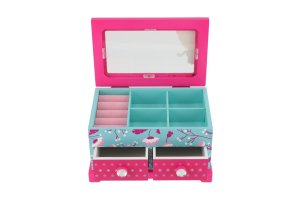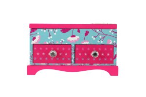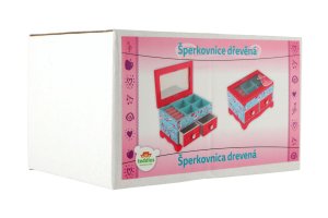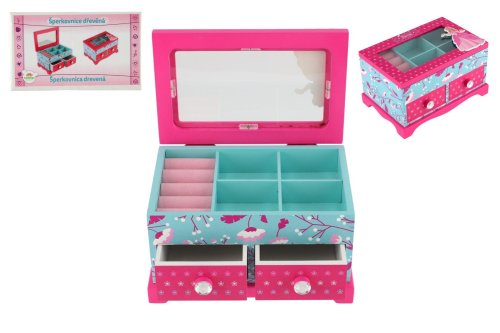 Šperkovnica bude ideálnym miestom na uloženie pokladov každého dievčaťa. Je vyrobená z dreva a má sklenené veko. Šperkovnica má modrú farbu a je pomaľovaná krásnym motívom kvietkov. Odklipávacie veko je ružové, má na sebe kvietky a princeznú. Táto farebná kombinácia bude ideálny doplnok pre detskú izbu. Vnútri je priestor na organizovanie suvenírov alebo šperkov. Šperkovnica má dve zásuvky. Rozmer šperkovnice: 18x12,5x12cm Nie je hračka