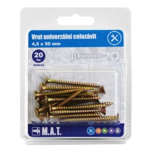 rozmery (pr. x D)): 4,5 x 50 mm materiál: Zn celozávit 20 ks Univerzálna skrutka je spojovacia súčiastka s vonkajším závitom, určená na vytváranie rozoberateľných spojov predovšetkým mäkkých materiálov (drevo, plast, …).