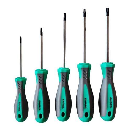 sada skrutkovačov TORX ENPRO- 5 ks kovový driek vyrobený z veľmi kvalitnej ocele S2 kalený hrot je magnetický a povrchovo chránený tvrdochrómom ergonomicky tvarovaná rukoväť (kombinácia polypropylénu a gumy) …