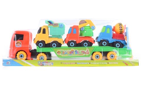 Plastový skrutkovací kamión s tromi autíčkami stavebných strojov. Rozmer kamiónu cca 39 x 9 x 7 cm. Rozmer autíčok cca 9,5 x 9,5 x 6 cm. Rozmer balenia cca 43 x 15,5 x 10 cm. Vek 3+