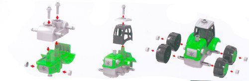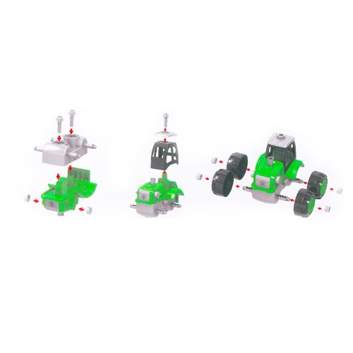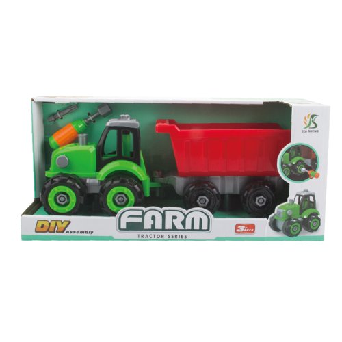 Zelený skrutkovací traktor s červenou vlečkou. Pomocou skrutkovača, ktorý nájdeš v balení, môžeš traktor ľahko rozložiť a zostaviť si ho znova. Rozvíja kreativitu. Veľkosť traktora s vlečkou je 32 cm.