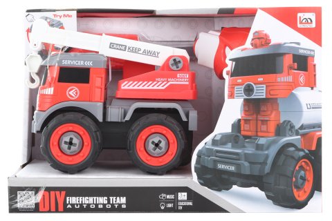 Skrutkovacie hasičské auto na diaľkové ovládanie. Auto je možné zoskrutkovať pomocou priloženého skrutkovača alebo vŕtačky. Z vŕtačky je možné vybrať motorček, ktorý sa vloží do auta a to potom jazdí pomocou ovládania dopredu a dozadu. Auto je možné tiež transformovať na robota. Auto tiež vydáva zvuky a svieti. Napájanie na 4 AAA batérie (nie sú súčasťou) a na 3 LR41 batérie (sú súčasťou). Rozmery hasičského auta cca 16 x 13 x 10 cm. Rozmery balenia cca 26,5 x 14 x 17,5 cm. Vek 3+