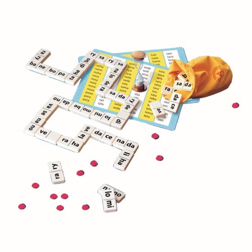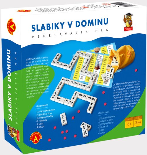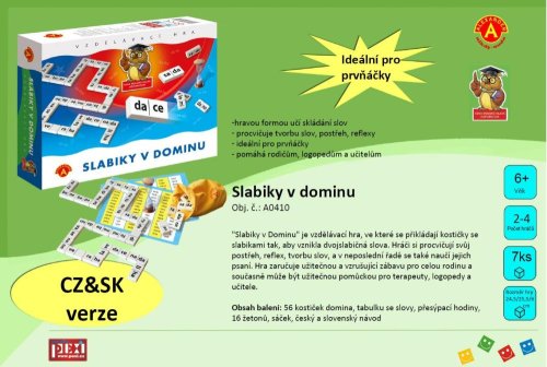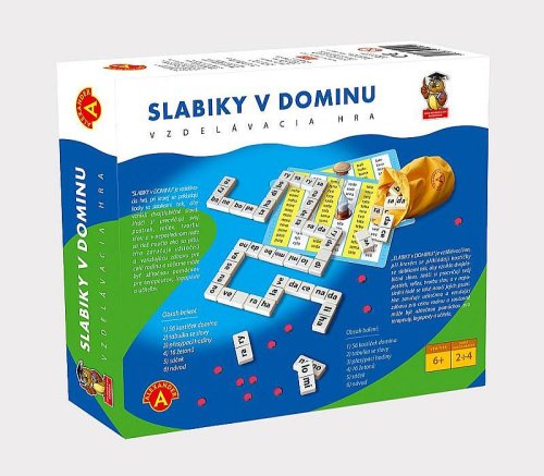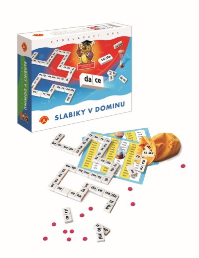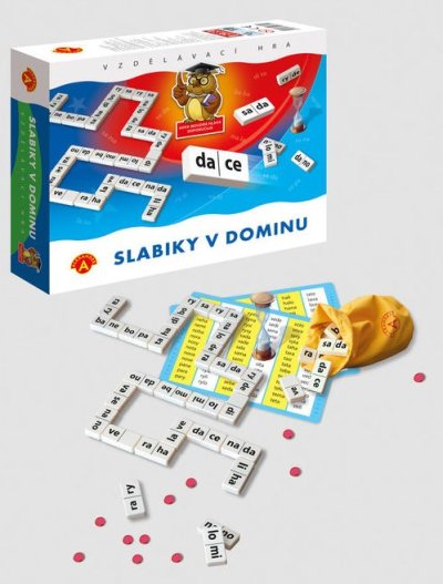 Didaktická hra určená pre predškolákov a predovšetkým prváčikov. Skladajte slová pomocou dominových kociek. Ideálne na precvičovanie čítania a písania slabík. Balenie obsahuje: 56 plastových kociek domina, tabuľku s nápovedou slov, návod, žetónky, presýpacie hodiny. Pre deti od 5 rokov.