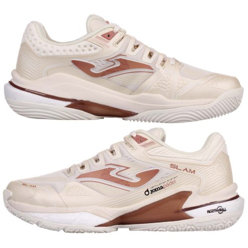 Nový Slam model značky JOMA na padlá a tvrdé povrchy je určený pre pravidelné a náročné hráčky. Aj naďalej si zachováva maximálnu úroveň priľnavosti, ochrany, stability a odpruženia. Zvršok je vyrobený z priedušnej sieťoviny, ktorá má elegantnú žakárovú úpravu s VTS perforáciou. Táto technológia umožňuje cirkuláciu vzduchu a zaisťuje tak správnu ventiláciu. Vďaka použitým technológiám SPORTECH a PROTECTION je topánka ľahká, flexibilná a odolná. Medzipodrážka má nový tvar, aj keď stále obsahuje technológiu DUAL REACTIVE, zloženú z horného phylonu a spodného REACTIVE BALL. Dosahuje dokonalú rovnováhu medzi odpružením, reaktivitou a stabilitou, ktorú posilňuje diel STABILIS. Všestranná podošva z gumy DURABILITY, tvorená malými kruhovými výstupkami na zlepšenie odolnosti na tvrdom povrchu. Uľahčuje sklzy počas rýchlej hry. Zahŕňa geometrickú štruktúru ROTATION pre uľahčenie otáčania.