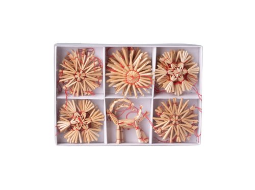 Tradičná sada slamených ozdôb s motívmi vločiek v prírodnom prevedení. Balenie obsahuje 27 kusov dekorácií starostlivo uložených v darčekovej krabičke. Ozdoby sú ľahké, odolné a ideálne na výzdobu vianočného stromčeka, vencov alebo zimných aranžmánov. Prírodný vzhľad dodá interiéru hrejivú a rustikálnu atmosféru. Dodávané ako mix tvarov vločiek. Tovar je dodávaný v mixe. Doručovaný tovar je vyberaný náhodne a nie je možné vybrať konkrétne prevedenie.
