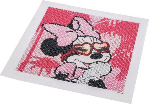 tlačený obraz veselej myšky Minnie s lepidlom uľahčujúcim lepenie diamantov. Na obraze sú tlačené aj písmená, ktoré pomáhajú udržať farebný poriadok, ale konečný vzhľad Minnie závisí od vášho výberu. diamantové kamienky pero na lepenie kamienkov tácka na triedenie kartónovej podložky pre archy