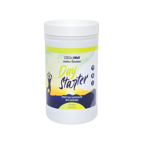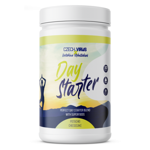 Day Starter je komplexný produkt v štýle Smoothie s obsahom superpotravín pre ten najlepší štart dňa. Základ tvorí kvalitný hrachový izolát a celozrnná ovsená múka pre jednoduché a ľahko stráviteľné doplnenie makroživín po nočnom pôste. Obsahuje prírodný kofeín z guarany a zeleného čaju na postupné a príjemné nakopnutie bez nežiaduceho dojazdu. Ďalej tiež kombináciu citrulínu s červenou repou na prekrvenie. Zmes je obohatená o našu skvelú zelenú zmes, ktorú poznáte z best-selleru Super Greens PRO V2.0 (spirulina, chlorela, mladý jačmeň a mladá pšenica) vrátane V-AntiOxi-Blend® (zmes antioxidantov), V-Shrooms-Blend® (zmes húb) a V-Dige-Blend® (zmes tráviacich enzýmov). Kvalitné živiny Day Starter obsahuje kvalitné a ľahko stráviteľné makroživiny. Proteín zastupuje izolát z hrachového proteínu (Pisane®), ktorý má podľa in vivo štúdií perfektnú využiteľnosť, sacharidy potom v menšej miere celozrnná ovsená múka. Samozrejmosťou je minimum cukrov (bez pridaných cukrov), aby produkt nemal negatívny vplyv na hladinu cukru v krvi. Ďalej tiež obsahuje slušné množstvo vlákniny, ktorá v mnohých jedálničkách stále chýba. Dávkovanie produktu je možné individuálne upraviť podľa nárokov vášho jedálnička a vašich cieľov. Zmes pre ranný boost Day Starter obsahuje starostlivo vybrané ingrediencie, ktoré pomôžu telu s jednoduchším naštartovaním bez nežiaducich účinkov. Základom je zmes na prekrvenie, ktorú zastupuje L-Citrulín a Sabeet® (extrakt z červenej repy). Ďalej produkt obsahuje zmes prírodného kofeínu z dvoch zdrojov - guarany a zeleného čaju. Táto zmes dodá telu ľahké nakopnutie bez nežiaduceho crasha. Jedna dávka produktu obsahuje 67 mg kofeínu, čo je zhruba jedno espresso. Ďalšie látky a blendy Day Starter obsahuje látky, ktoré môžete poznať zo Super Greens (avšak nie je dobré produkt zamieňať, každý má iné zameranie!). Obsahuje zelené superpotraviny (spirulina, chlorela atď.), ďalej tiež naše blendy: V-AntiOxi-Blend® (zmes antioxidantov), V-Shrooms-Blend® (zmes húb) a V-Dige-Blend® (zmes tráviacich enzýmov). Pre podporu normálnej funkcie imunitného systému je tu pridaný aj Vitamín C. Textúra a chuť Day Starter svojou textúrou pripomína smoothie, teda hustejší drink a rovnako ako domáca smoothie ponúka veľké množstvo benefitov s výhodou extrémne rýchlej prípravy. Stačí použiť shaker a vodu, nie je nutné používať mixér alebo špiniť ďalší riad. Chuť sme vyladili do veľmi príjemného a vyváženého chuťového profilu, ktorý poteší väčšinu používateľov. Chuť je jemná a prírodná. Pre koho je produkt určený Day Starter je designovaný pre užívateľov, ktorí pred fyzickou aktivitou nemajú radi hutné jedlá, ale zároveň im nevyhovuje byť úplne nalačno. Pre ľudí, ktorí chcú po nočnom pôste telu dodať okamžite a ľahko využiteľné látky na príjemné prebudenie a nakopnutie. Produkt môže svojim zameraním slúžiť ako ľuďom z fitness, tak aj bežcom. Slúži tiež pre vyťažených ľudí, ktorí nestíhajú pred prácou/školou chystať pracne vlastnú smoothie a chcú mať čo najskôr pripravený chutný a výživný nápoj. Náš produkt ale v žiadnom prípade plne nenahrádza jedlo, slúži ako doplnok k jedálničku. Odporúčané dávkovanie: