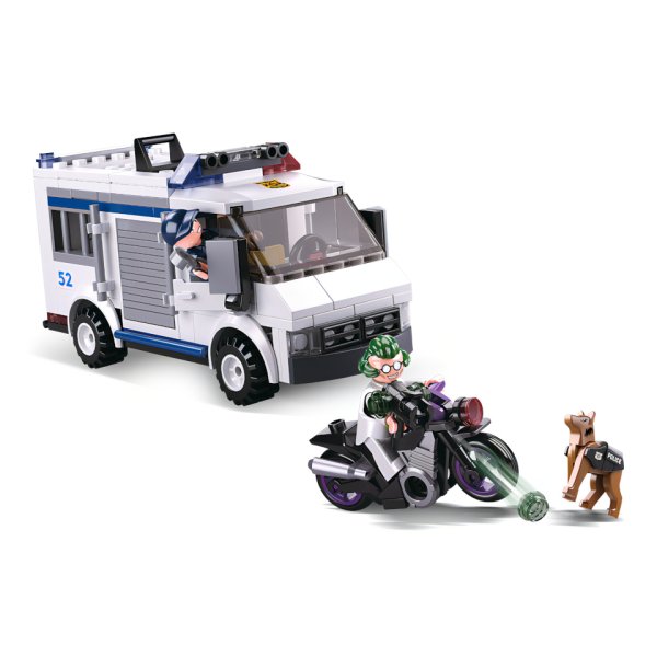 z pištole je možné strieľať vozidlo má zadné aj bočné dvere otvárací pes môže hýbať hlavou dĺžka vozidla: 14,6 cm možno stavať podľa podrobného návodu alebo podľa vlastnej fantázie kocky do seba ľahko a presne zapadajú stavebnice Sluban sú kompatibilné s kockami z ďalších stavebníc