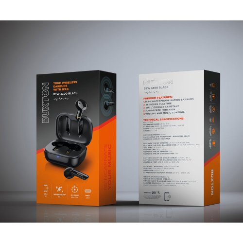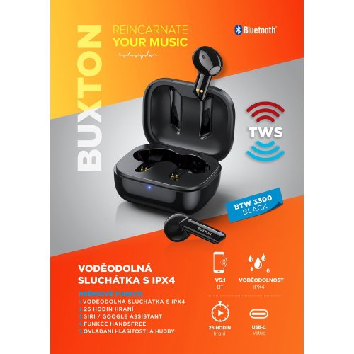 Buxton BTW 3300 patrí medzi úplne bezdrôtové slúchadlá . Vďaka tomu vás neobmedzujú v pohybe a vy môžete počúvať hudbu aj pri športe alebo na prechádzke so psom. Spárujte ich so svojim mobilom či notebookom a spríjemnite si cvičenie, upratovanie v domácnosti alebo sa inšpirujte muzikou pri maľovaní. Žiadne káble vám už neprekážajú. Slúchadlá fungujú až do vzdialenosti 10 metrov od spárovaného zariadenia . Majú krytie IPX4 a vďaka tomu odolajú striekajúcej vode.