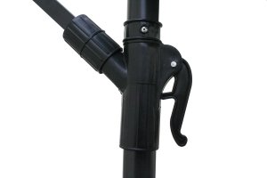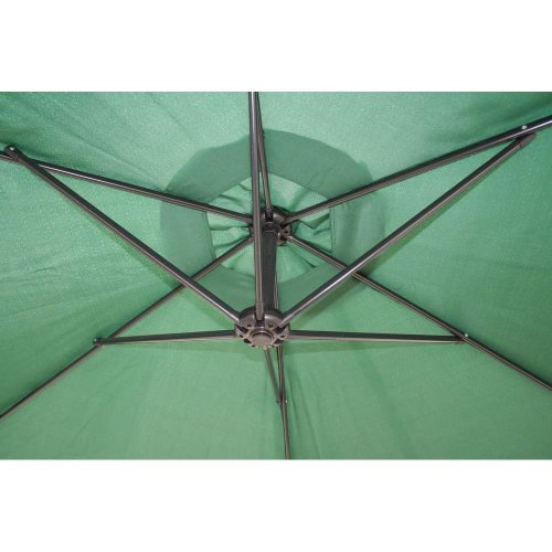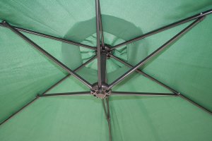 Závesný slnečník priemer 300 cm má 6 oceľových rebier 12 x 18 mm, je vyrobený z polyesteru 160 g/m2. Pevná oceľová tyč má priemer 4,8 cm. Stojan, ktorý je súčasťou výrobku, je možné zaťažiť betónovými dlaždicami pre zvýšenie celkovej stability. Otváranie slnečníka sa vykonáva kľučkou. Navíjací systém má plastové puzdro s kovovým navíjacím mechanizmom - kovová kľučka, kovový hriadeľ a kovový pastorok s kovovou závlačkou. Farba tmavo zelená.