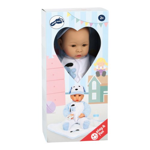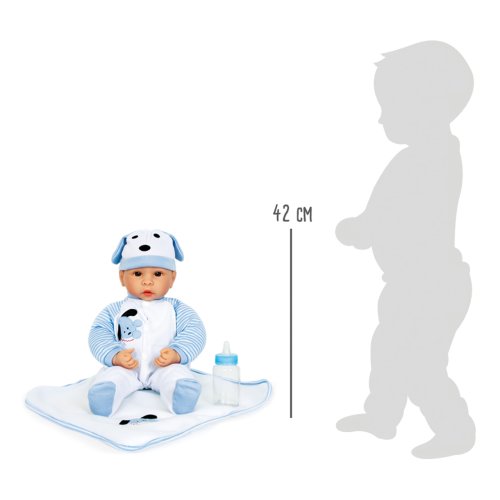 Malý Beno je veľký milovník psov. Bábika má nasadenú čiapočku a dupačky s roztomilým modro-bielym motívom šteňaťa. Balenie zahŕňa dojčenskú fľaštičku, cumlík, ktorý sa dá vložiť do pusy, a mäkkú prikrývku . Hlavné vlastnosti: obsahuje oblečenie, dojčenskú fľašu, cumlík a mäkkú deku