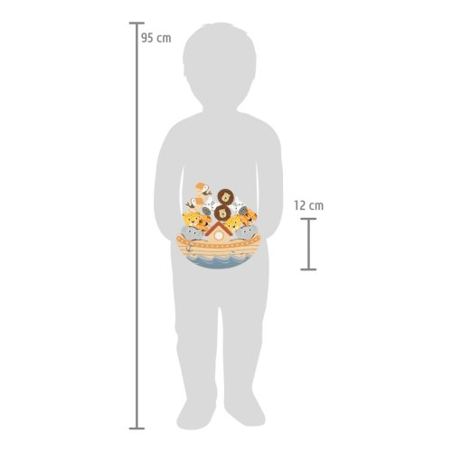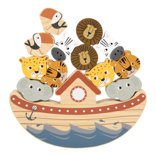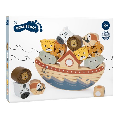 Vybalansujete vratkú hárku a zachránite pred potopou všetky zvieratká? Hádžte kockou a ukladajte dieliky príslušných farieb s motívmi roztomilých zvierat na základňu v podobe rozhojdanej lode. Rozvíjajte hrou koordináciu rúk a zraku či trpezlivosť. Hračka je veľmi robustná a odolná, vyrobená z masívneho dreva a vyvedená v atraktívnej farebnej schéme produktového radu Small Foot Safari. Hlavné vlastnosti: základňa, 12 herných dielikov a hracia kocka odolné prevedenie z masívneho dreva