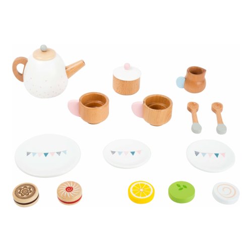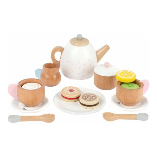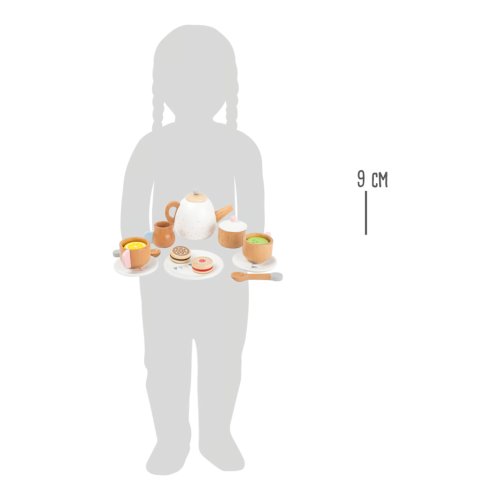 Máte chuť na lahodný čaj alebo kávu so zákuskom? Sprostredkujte svojim deťom možnosť zohrať rolu spôsobných hostiteľov, nechajte sa obslúžiť a vychutnajte si s nimi sladkú prestávku! S bohatou čajovou súpravou môžu deti rozvíjať fantáziu, učiť sa pravidlám servisu a spoločenskému správaniu. Prekvapí Vás starostlivým spracovaním z masívneho dreva, súčasti sú robustné a zvlášť prispôsobené detským rúčkam. Prírodný materiál šikovne priznáva a hravo kombinuje s jemnými pastelovými odtieňmi. Prevedenie kladie dôraz na detail, viečka kanvičky aj cukorničky sú preto odnímateľné a hra môže byť ešte uveriteľnejšia. Sadou môžete vhodne doplniť detskú kuchynku, stánok, alebo makety dezertov. Hlavné vlastnosti: kanvička s viečkom, 2 šálky s podšálkami a lyžičkami, 3 rôzne kapsule náplní, mliekovka, cukornička s viečkom, tanierik a 2 makety sušenekatraktívne a robustné prevedenie z masívneho dreva