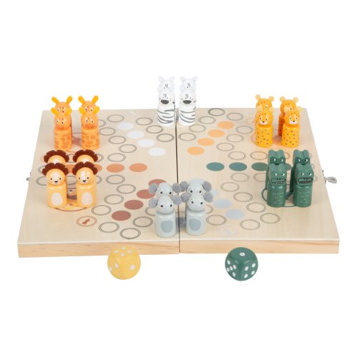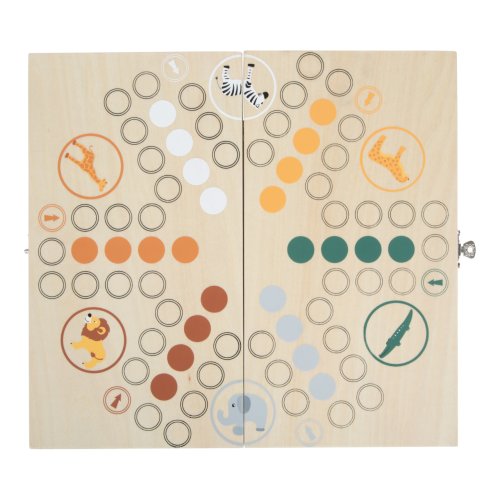 Skvelá zábava až pre 6 hráčov každého veku! V tejto klasickej hre vyrobenej z dreva musíte dostať svoje zvieratká zo savany do domčeka. Zebra, žirafa, krokodíl, slon, leopard a lev vyzerajú skoro ako hovorí. Tieto figúrky sú vhodné pre deti, sú drevené a majú plyšové prvky. Herná doska je praktická, po zložení sa z nej opäť stane úložný box. Dve herné kocky vám ukážu, o koľko polí sa môžete posunúť. Klasická stolová hra v trendy dizajne, ktorá deti naučí počítať, spoznávať farby a zvieratá. Deti sa tiež naučia prehrávať. Ideálne aj na cesty. Hlavné vlastnosti: pre 2–6 hráčovherná doska, 24 figúrok a 2 kockypraktické balenie