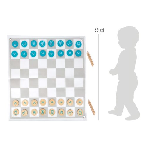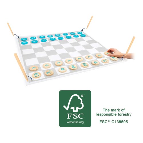 Dvojica klasických hier v sete a na veľkom formáte! Šach a dáma, ktoré sú vhodné dovnútra aj von, pripevniť ich môžete 4 drevenými kolíkmi cez otvory v rohoch hernej dosky. Herné kamene sú vyrobené zo 100% certifikovaného FSC® dreva, sú svetlé modré a prírodné – je tak jednoduché ich zachytiť, keď sa vám zakotúľa do trávy. Kamene ilustrujú akým smerom sa môžu pohybovať, táto sada je teda vhodná aj pre úplných začiatočníkov. Skvelá hra, ktorá zabaví malých aj veľkých, môžete si ju so sebou vziať napríklad na piknik. Hlavné vlastnosti: FSC drevocestovná hra2 v 1 Značka a certifikát FSC® (Forest Stewardship Council) zaručuje, že drevo, z ktorého bol produkt vyrobený, nebolo vyťažené nelegálne a pochádza z lesov obhospodarovaných šetrným či prírode blízkym spôsobom, v ktorom sú dodržiavané prísne environmentálne a sociálne požiadavky. Značka FSC® na výrobku znamená, že svojim nákupom pomáhate chrániť lesy a podporujete šetrné, zodpovedné či prírode blízke hospodárenie, vďaka ktorému sú naše lesy stabilnejšie, zdravšie, majú prirodzenú druhovú skladbu a lepšie odolávajú negatívnym následkom klimatických zmien.