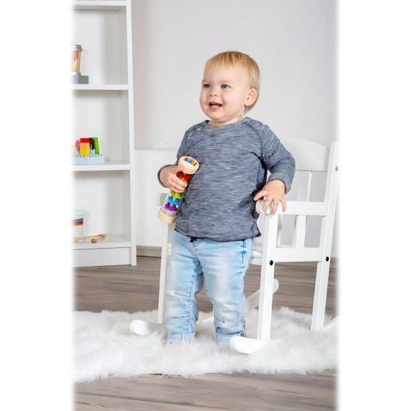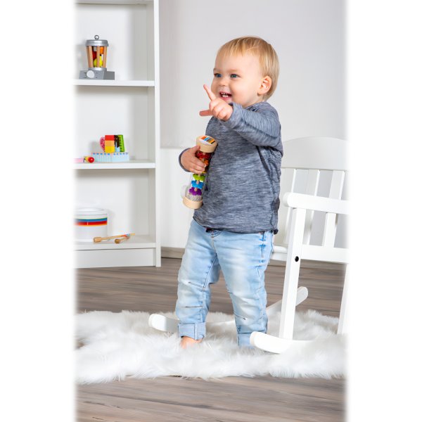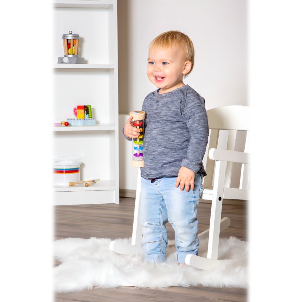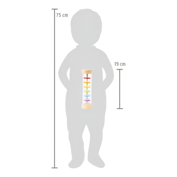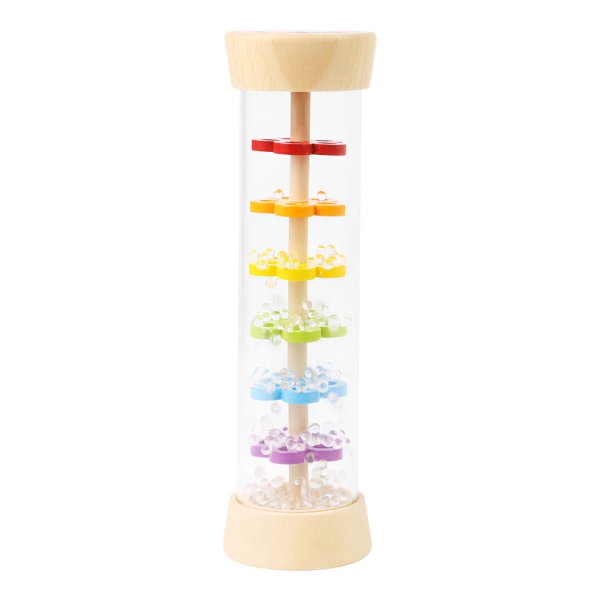 Tak presne takto znie dážď! S dažďovou palicou môžete imitovať zvuky jemného dažďa. Môžete ju použiť ako hrkálku, rytmickú hračku. Telo hračky je priehľadné, môžete tak pozorovať ako sa guličky pohybujú cez zábrany v tvare kvetín. Hlavné vlastnosti: hračka trénuje akustické a vizuálne vnímanie vhodná tiež ako chastítko pre nemluvňata upokojuje zmysly detí i dospelých