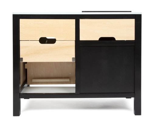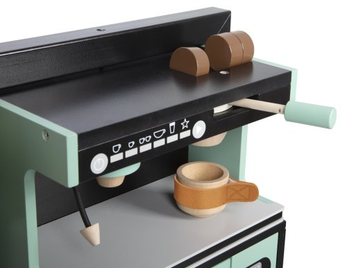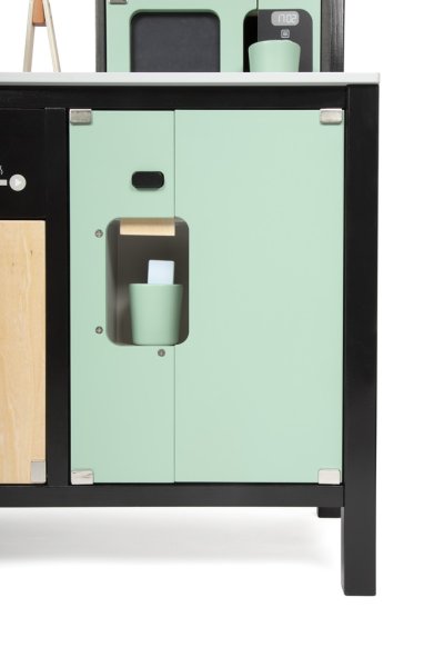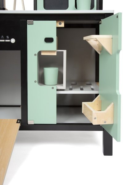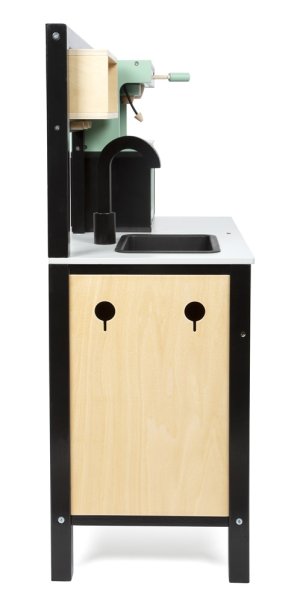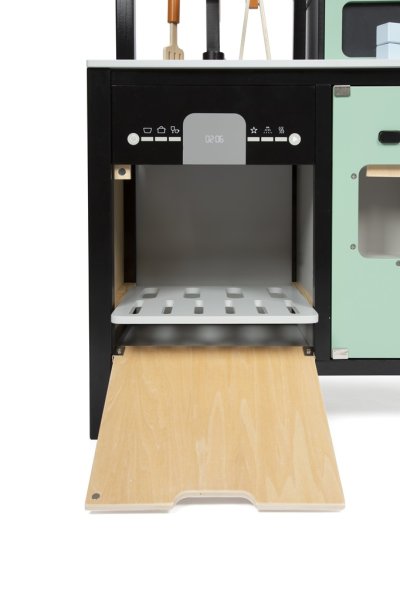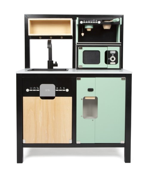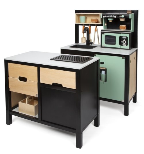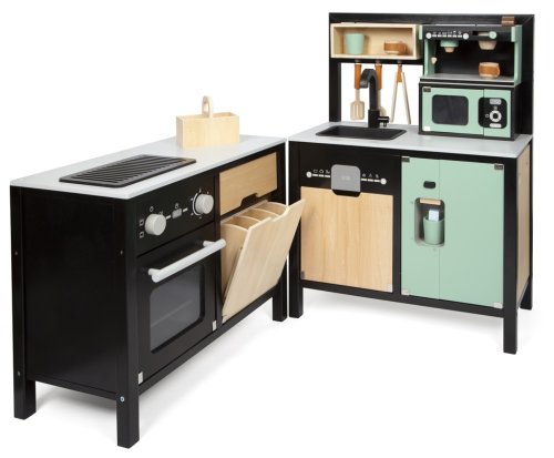 Táto drevená detská kuchynka v industriálnom dizajne ponúka všetko, čo malé kuchárky alebo kuchári potrebujú na varenie. Prednosťou je moderný vzhľad v štýlovej farebnej kombinácii čierneho rámu a prírodného dreva, praktický kuchynský ostrovček, ktorý sa dá použiť samostatne alebo pridať k ďalšiemu dielu a vytvoriť rohovú kuchynskú zostavu. A toľko spotrebičov, riadu a doplnkov! Súčasťou je okrem iného varná doska, rúra, mikrovlná rúra, chladnička s výrobníkom ľadu, kávovar, odpadkový kôš, 3 kusy kuchynského náčinia, hrniec s pokrievkou, panvica, 2 šálky na kávu, tégliky a 3 kocky ľadu. Dvierka sa samozrejme dajú otvárať. Hlavné vlastnosti: podporuje deti v dlhotrvajúcej predstavivej hrerôzne odkladacie a úložné priestoryrozvíja hru na role a sociálne zručnosti