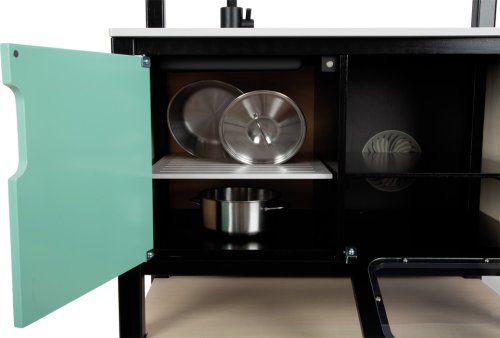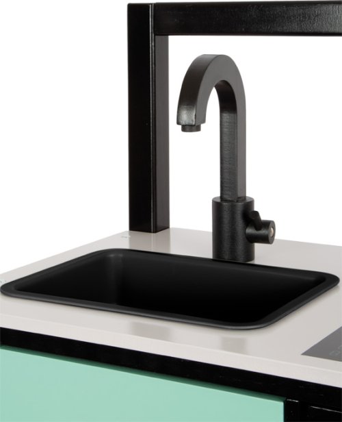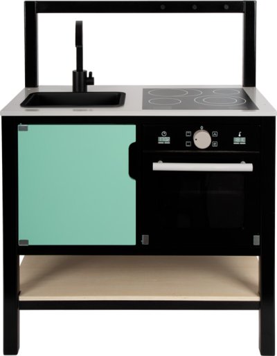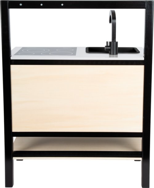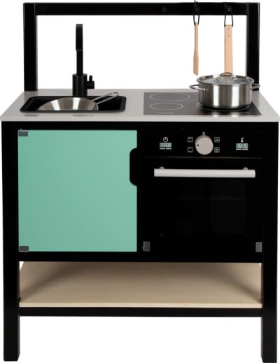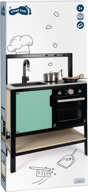 Kuchyňa pre malých špičkových kuchárov e. Vďaka svojmu modernému modulárnemu vzhľadu kuchyne, ktorý je zdôraznený štýlovou konštrukciou čierneho rámu, je táto drevená kuchynka na hranie absolútnym pútačom. Chytré detaily robia kuchynku ešte zaujímavejšou - vodovodný kohútik s pákou na reguláciu teploty vody, odnímateľný plastový drez, rúra s vyberateľným plechom, cvakajúce gombíky spolu s ilustráciou na spotrebičoch vytvárajú mimoriadne autentický zážitok. Súčasťou je panvica, hrniec s pokrievkou, lopatka a grilovacie kliešte. Takže je táto kuchyňa ihneď pripravená k hre! Obzvlášť praktická a funkčná je skrinka pod pracovnou plochou, aj háčiky na zavesenie kuchynského príslušenstva. Takže všetky kuchynské náčinie je možné po hre úhľadne usporiadať a mať ich po ruke. Šikovným detailom je dno police v skrini, ktoré možno tiež použiť ako grilovací rošt pre rúru v kuchynke . Ľavú stranu skrine je možné flexibilne využiť ako chladničku alebo umývačku . Vďaka ľahkému rámu sa drevená kuchynka tiež ľahko premiestňuje, takže namiesto hry je možné ma niť. Je to vizuálne príťažlivá, moderná detská kuchynka, ktorá ponúka všetko, čo mladí špičkoví kuchári potrebujú na naplnenie svojej fantázie. Hlavné vlastnosti: navrhnutá tak, aby deti podporovala v dlhotrvajúcej predstavivej hrerôzne odkladacie a úložné priestorybatérie nie sú súčasťou baleniapodporuje hranie rolí a sociálne zručnosti
