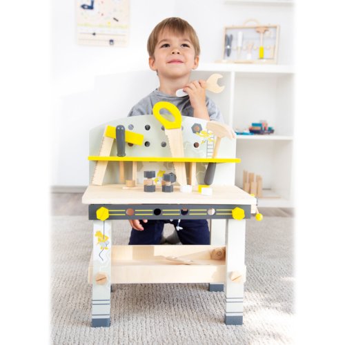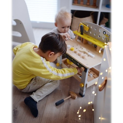 V tejto dielni sa toho deje skutočne veľa. S týmto kompaktným ponkom v klasických farbách, ktorý je viditeľne drevený, si deti môžu otestovať svoju zručnosť. Deti vám tiež môžu pomôcť so zložením tohto herného ponku! Všetko náradie a doplnky môžete do ponku uložiť tak, aby nezaberali veľa miesta. V balení 5 kusov náradia a mnoho doplnkov – 1 zverák, 3 perforované drevené pásky, 1 meter, 1 pílka, 2 skrutkovače, 1 kladivo, 5 skrutiek, 5 matiek, 3 drevené klince. Hlavné vlastnosti rozmanitá hra na kompaktnom ponkupekné farby s viditeľným drevompäť ks dreveného náradia a zverákdeti môžu pomôcť so zložením ponkujednoduché uloženie náradia a doplnkovpekné detské ilustrácie Miniwob MiniwobZoznámte sa s malými woby, nadšenými krokodílími majstrmi! S ich pomocou ide všetky práce ako po masle a žiadna stavba nie je dosť veľká a premyslená. Pestrá rada nástrojov a náradia poskytuje dokonalú zábavu pre všetkých malých remeselníkov, prostredníctvom ktorých môžu byť kreatívne a realizovať všetky svoje fantastické nápady. Jednotlivé sady je možné medzi sebou kombinovať a rozširovať s rastúcimi schopnosťami detí. Vďaka jednotiacemu farebnému motívu a vyobrazeniam roztomilých Wobov je možné vytvoriť jedinečný a ucelený dielenský kútik, ktorý bude zároveň hodnotnou stavebnicou rozvíjajúcou zručnosť a predstavivosť.