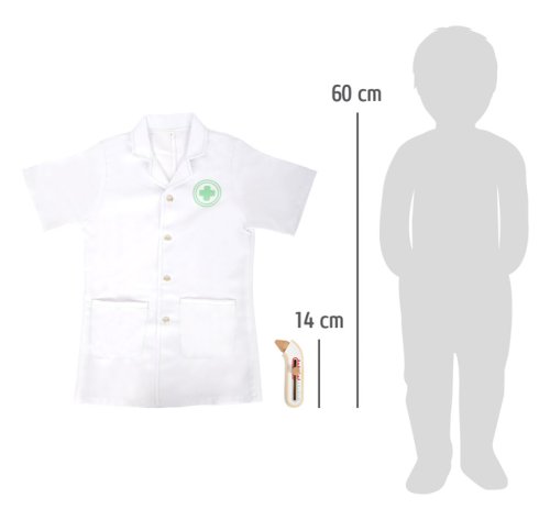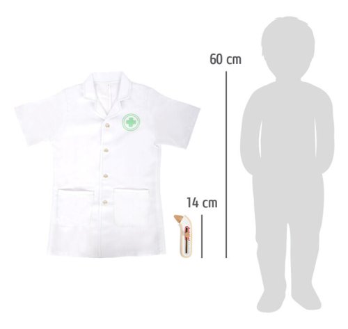 Kompletná hracia sada s lekárskym plášťom a zdravotníckym vybavením. Nájdete tu injekčnú striekačku, stetoskop a teplomer z robustného dreva. Piest striekačky sa po stlačení zatiahne. Teplomer má nastaviteľný ukazovateľ teploty. Lekársky plášť má dve praktické vrecká, zapína sa na patentky, takže si ho môžu mladí medici rýchlo obliecť aj vyzliecť. Ideálna hračka na hranie na role alebo ako kostým na karneval. Vhodné pre deti, ktoré sú vysoké 105-110 cm (veľ. 110). Ideálny doplnok k doktorskej taške a ďalším podobným produktom . Hlavné vlastnosti: lekársky plášť a ďalšie doplnky pre deti vysoké 105-110 cm perfektné pre hranie na rolky alebo na karneval