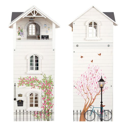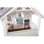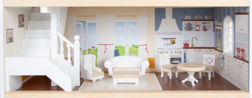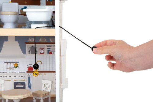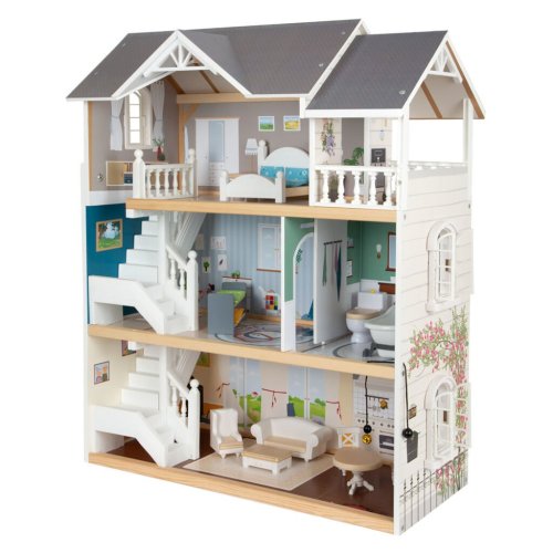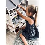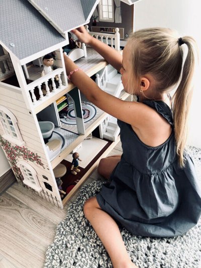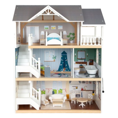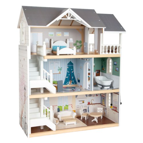 Veľký, stabilný drevený domček pre bábiky zaujme svojim detailným dizajnom ako vo vnútri, tak zvonku. Vďaka otvorenej prednej strane je ideálny pre spoločnú hru viacerých detí, ktoré sa môžu ľahko hrať zároveň. Domček má tri podlažia prepojené schodiskom a ponúka celkom päť priestranných miestností – jedáleň s obývacou izbou, detskú izbu, kúpeľňu, spálňu a lodžiu, ktoré poskytujú dostatok priestoru pre kreatívne hranie a vytváranie vlastných príbehov. plastovými detailmi, ktoré zaisťujú realistickú a zábavnú hru. Nechýbajú ani schody, posuvné dvere, otvárateľné okná, nočné stolíky so zásuvkami a dokonca aj funkčný zvonček, ktorý oznamuje príchod návštevy – všetky tieto prvky dodávajú domčeku autentickosť a podporujú detskú predstavivosť. Výrobok vyžaduje montáž, ktorá je jednoduchá vďaka detailnému návodu na zostavenie. Tento krásny domček sa tak stane nielen obľúbeným herným centrom, ale aj pôsobivým doplnkom detskej izby. Hlavné vlastnosti: vďaka svetlej vonkajšej fasáde a modernému dizajnu sa vila hodí do akejkoľvek detskej či obývacej izby dostatočne veľký pre spoločnú hru viacerých detífunkčný zvonček a prvky nábytku obsahuje 12 ks nábytku s doplnkami vhodné pre bábiky do veľkosti 12 cm. Ocenenie hračky: Top 10 Spielzeug Nominiert