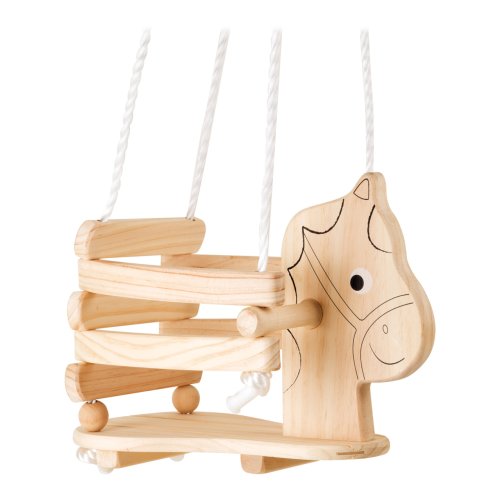 Hyjé, hojdaním dopredu! Roztomilá hojdačka s hlavou koníka je vďaka priestrannému sedátku, opierke a vyvýšenému hradeniu nielen pohodlná, ale aj veľmi bezpečná. Po stranách ponúkajú madlá, ktorých sa deti môžu pevne chytiť, a hojdanie sa tak stane ešte istejším. Vyrobená je zo starostlivo opracovaného dreva a ponúka prírodnú úpravu, ktorú je možné farebne upraviť podľa vlastnej fantázie. Záves je tvorený pevnými, odolnými, ale aj poddajnými nylonovými lanami, ktoré sú zakončené kovovými krúžkami na zavesenie. Hlavné vlastnosti: vyvýšené hradenie a madlá pre väčšiu bezpečnosťrobustné a odolné prevedenie z masívneho drevenosnosť 30 kg