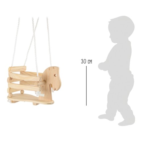 Hyjé, hojdaním dopredu! Roztomilá hojdačka s hlavou koníka je vďaka priestrannému sedátku, opierke a vyvýšenému hradeniu nielen pohodlná, ale aj veľmi bezpečná. Po stranách ponúkajú madlá, ktorých sa deti môžu pevne chytiť, a hojdanie sa tak stane ešte istejším. Vyrobená je zo starostlivo opracovaného dreva a ponúka prírodnú úpravu, ktorú je možné farebne upraviť podľa vlastnej fantázie. Záves je tvorený pevnými, odolnými, ale aj poddajnými nylonovými lanami, ktoré sú zakončené kovovými krúžkami na zavesenie. Hlavné vlastnosti: vyvýšené hradenie a madlá pre väčšiu bezpečnosťnosnosť 30 kgrobustné a odolné prevedenie z masívneho dreva