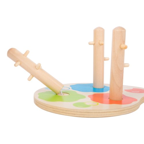 Pestrofarebná drevená motorická hračka v štýle maliarskeho plátna. Najmenší umelci sa môžu pokúsiť triediť drevené geometrické tvary ako trojuholník, obdĺžnik a kruh k správnej farbe na maliarskej palete. Nie je to tak jednoduché, ako to vyzerá, pretože tvary treba skladať tak, aby im prekážky na pohyblivých drevených stĺpoch nebránili. Kto je pre túto výzvu? Hlavné vlastnosti: rozvíja predstavivosť možnosť naučiť sa farby a tvary priestorové povedomie a obratnosť koordinácia rúk a očí pomáha učiť sa tvorivosti a logickému mysleniu
