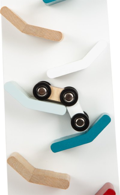 Táto kaskádová veža priťahuje pohľady každého! Pri vypustení pestrofarebných autíčok zhora sa začnú rútiť po rôznych úrovniach dráhy. Vydávajú zábavné klapavé zvuky a na záver sa rozbehnú po podlahe. Je to upokojujúca a zároveň fascinujúca drevená hračka! Vďaka moderným farbám v kombinácii s bielou a prírodným drevom je sada aj skvelou dekoráciou! Hlavné vlastnosti: veža a 2 autíčka pri jazde dole vozidlo robí salta rozvíja sústredenosť a jemnú motoriku