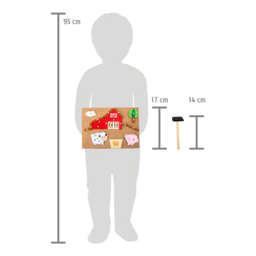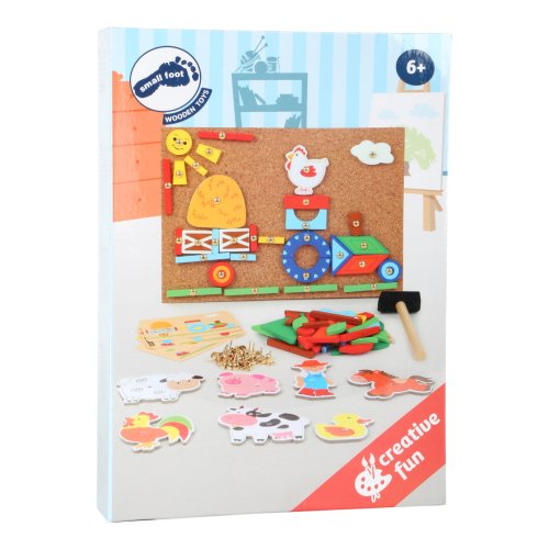 Tvorivá zábava nikdy nekončí! S týmto kladivkom, dielikmi a korkovou doskou môžete vytvoriť mnoho podôb farmy. Štyri vzorové karty navrhujú motívy obrazu. Súprava je balená v boxe a ľahko sa prepravuje. Hlavné vlastnosti: podporuje kreativitu a koncentráciu podporuje jemnú motoriku praktický úložný box