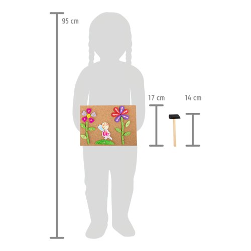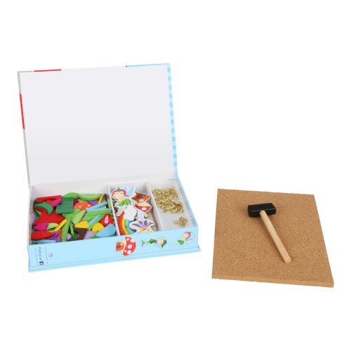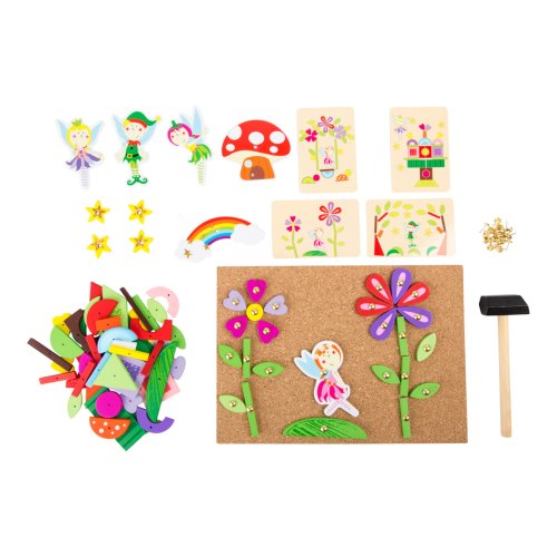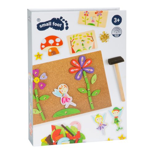 S touto hrou si môže každé dieťa vyrobiť svoj vlastný nástenný obrázok s motívom víl. Drevené a kartónové dieliky skladačky majú predvŕtané otvory, malé klinčeky možno ľahko zatĺcť do korkovej dosky dreveným kladivkom. Balenie obsahuje aj štyri obojstranne potlačené karty s návrhmi motívov. Hlavné vlastnosti: podporuje kreativitu a koncentráciu podporuje jemnú motoriku praktický úložný box