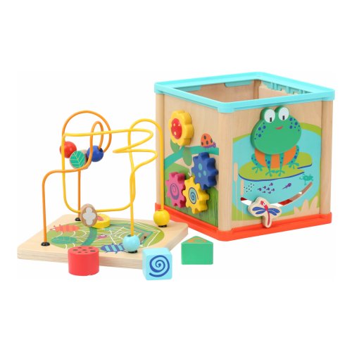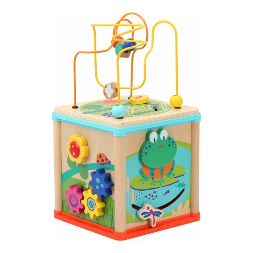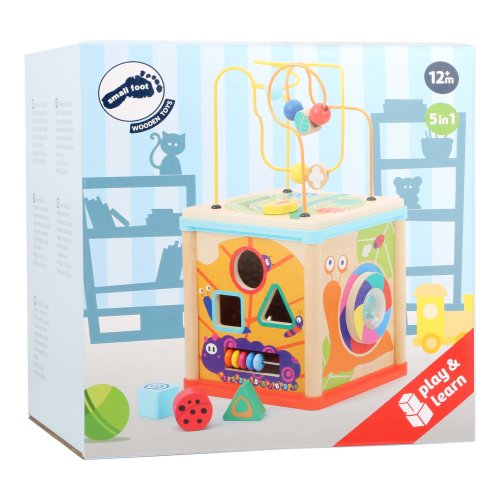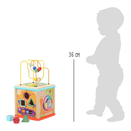 Motorická kocka ponúka na svojich stenách mnoho príležitostí na hry a zábavu. Detskú zručnosť a orientáciu v priestore je možné prirodzene rozvíjať korálkovým bludiskom na veku, vkladačkou, alebo ozubenými kolieskami. Kocka je bohato dekorovaná pestrofarebnými motívmi s mnohými roztomilými zvieratkami, tie môžu zároveň s rozmanitými tvarmi, hrkálkou a ďalšími atrakciami pomôcť rôznymi spôsobmi zdokonaľovať poznávacie zručnosti detí. Hračka je vyrobená zo silnej preglejky a odolného nezávadného plastu, môže tak ponúknuť vysokú životnosť. Vďaka otočnému veku je prakticky skladná a je možné ju hravo umiestniť do poličky, ktorú spestrí svojou farebnosťou. Hlavné vlastnosti:kocka s vekom a 3 diely vkladačky5 stien s rôznymi atrakciamirobustné a odolné prevedenie
