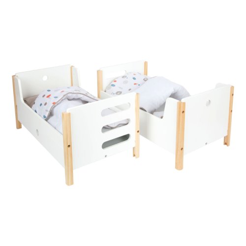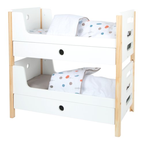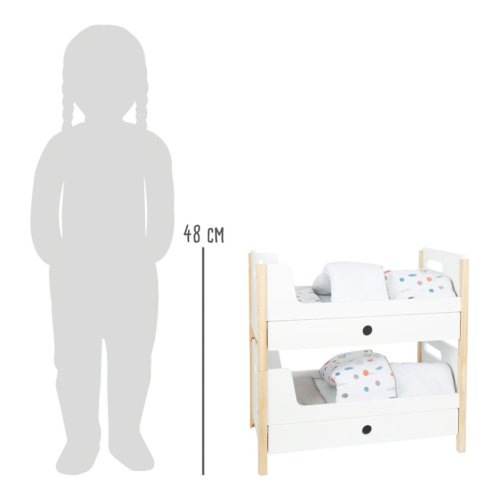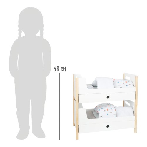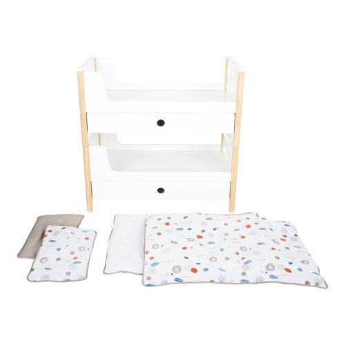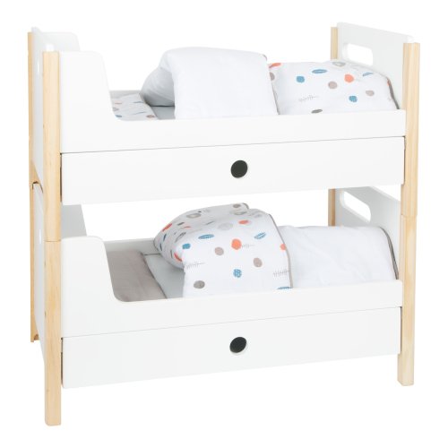 Krásna poschodovka! Nadchne vás funkciou aj škandinávskym dizajnom, vďaka ktorému sa pekne zmestí do každej detskej izby. Je moderná, obojstranná, má rodovo neutrálne obliečky a oversized periny, v ktorých sa krásne vyspia bábiky a plyšové hračky do 46 cm. Poskladaním postelí na poschodovej sa na jednej strane vytvorí rebrík. Šuplíky pod každou z postelí sú perfektné na uloženie doplnkov bábik. Vysoko kvalitná, stabilná konštrukcia, zaoblené hrany, viditeľne z dreva... Perfektná hračka do každej detskej izby. Hlavné vlastnosti Môžete použiť ako jednolôžka alebo poschodovú posteľ. stoličku až po skriňa. Zákazníkov ľahko zaujmú jednotným funkčným a decentným dizajnom využívajúcim priame línie a striedme neutrálne farby. Vďaka tomu spolu môžu vytvoriť ucelené harmonické súpravy, ktoré vkusne doplnia moderný interiér. Dômyselná konštrukcia a kvalitné spracovanie pomáhajú zaistiť vysokú stabilitu, bezpečnosť a dlhú životnosť. Založte s ich pomocou štýlový kútik pre bábiky, kde môžu Vaše deti rozvíjať svoju fantáziu a opatrovateľské schopnosti.