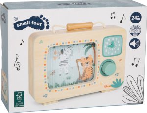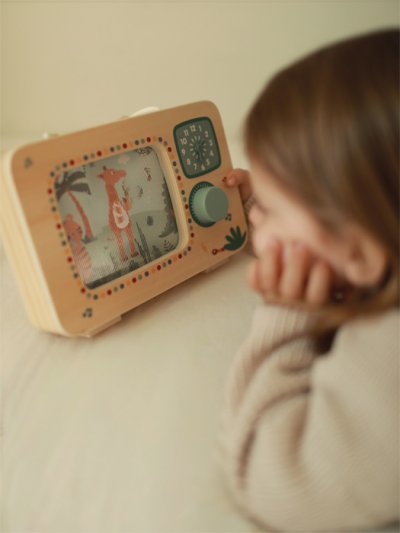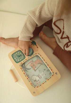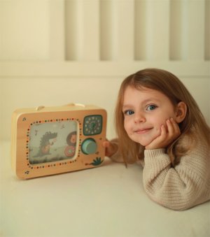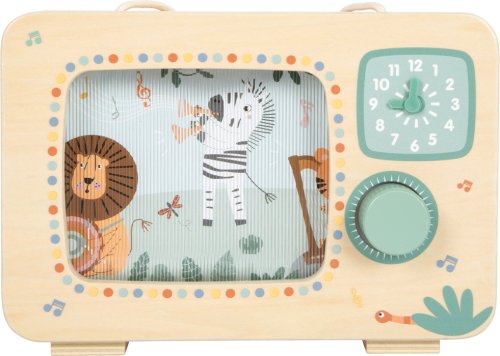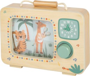 Táto kúzelná hudobná skrinka v tvare televízie vyrobená zo 100% certifikovaného dreva FSC® prináša deťom radosť z hudby, pohybu aj objavovania. Po otočení gombíka sa farebný obrázok safari zvieratiek rozpohybuje a zaznie jemná melódia, sprevádzaná príjemným cvakavým zvukom otočného gombíka. V hlavnej úlohe je veselý orchester zvieratiek zo safari, ktorý ožíva pri každom otočení. Vďaka praktickej rukoväti si môžu deti hraciu skrinku ľahko vziať kamkoľvek so sebou. Na prednej strane sa nachádzajú hodiny s potlačeným ciferníkom a pohyblivými ručičkami, ktoré lákajú k prvým hrám s časom. Hračka rozvíja jemnú motoriku, koordinácia ruka-oko, sluchové aj zrakové vnímanie a podporuje predstavivosť. Perfektne ladí s ostatnými produktmi z obľúbenej kolekcie Safari, spoločne tvoria harmonický svet plný hudby a dobrodružstva. Hlavné vlastnosti: vyrobená zo 100% certifikovaného dreva FSC® v tvare televízie, originálny a dekoratívny doplnok detskej izby pohyblivý obrázok safari zvieratiek otočný gombík s jemným cvakavým zvukom praktická rukoväť umožňuje ľahké prenášanie kamkoľvek potlačené hodiny s pohyblivými ručičkami rozvíja jemnú motori certifikát FSC® (Forest Stewardship Council) zaručuje, že drevo, z ktorého bol produkt vyrobený, nebolo vyťažené nelegálne a pochádza z lesov obhospodarovaných šetrným či prírode blízkym spôsobom, v ktorom sú dodržiavané prísne environmentálne a sociálne požiadavky. Značka FSC® na výrobku znamená, že svojim nákupom pomáhate chrániť lesy a podporujete šetrné, zodpovedné či prírode blízke hospodárenie, vďaka ktorému sú naše lesy stabilnejšie, zdravšie, majú prirodzenú druhovú skladbu a lepšie odolávajú negatívnym následkom klimatických zmien.