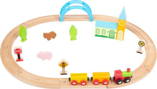Železničná idylka v detskej izbičke! Táto kompaktná drevená vláčikodráha s príslušenstvom má všetko, čo rozbúši srdce všetkých milovníkov techniky. Okruh je možné jednoducho a rýchlo zostaviť a vďaka početnému príslušenstvu premeniť na krajinu hodnú vlakovej vychádzky. Okrem železnice s mostom a vlakovej súpravy v sade nájdete aj značky usmerňujúce prevádzku, budovy, zvieratá a stromy. Hlavné vlastnosti: obsahuje 24 dielov podporuje predstavivosť, obratnosť a koordináciu