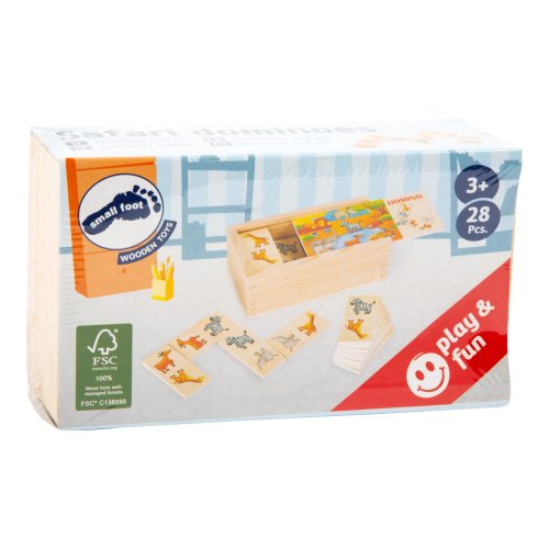 Nech hra začne! Toto domino je vyrobené zo 100% certifikovaného FSC® dreva. Veľké kocky so zvieratami safari. Dieliky je možné jednoducho uložiť do dreveného boxu. Hlavné vlastnosti: rozvíja jemnú motoriku detípodporuje logické myslenievyrobené zo 100% FSC dreva Značka a certifikát FSC® (Forest Stewardship Council) zaručuje, že drevo, z ktorého bol produkt vyrobený, nebolo vyťažené nelegálne a pochádza z lesov obhospodarovaných šetrným či prírode blízkym spôsobom, v ktorom sú dodržiavané prísne environmentálne a sociálne požiadavky. Značka FSC® na výrobku znamená, že svojim nákupom pomáhate chrániť lesy a podporujete šetrné, zodpovedné či prírode blízke hospodárenie, vďaka ktorému sú naše lesy stabilnejšie, zdravšie, majú prirodzenú druhovú skladbu a lepšie odolávajú negatívnym následkom klimatických zmien.