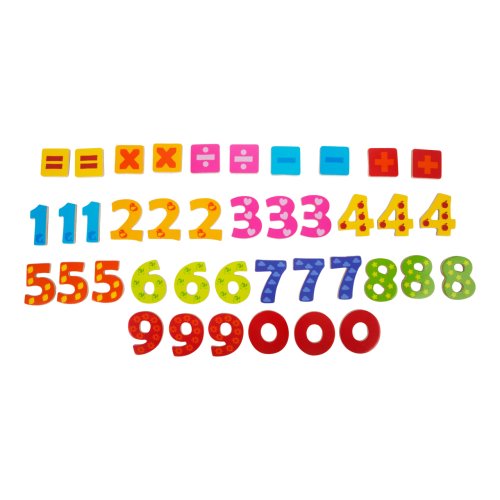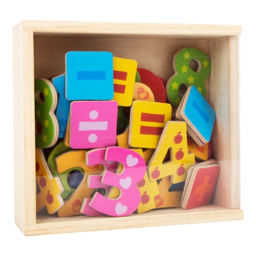 Súprava obsahuje 40 farebne maľovaných dielikov s číslami od 0 do 9 na magnetickom laminovanom dreve. Tieto dieliky je možné uložiť do drevenej krabičky s priehľadným vekom, kde sa zaručene nestratí. Deti môžu zostaviť a vyriešiť svoje prvé matematické rovnice a rozvíjať tak svoje logické myslenie. Veselé čísla môžete pripevniť na mnohé miesta ako napr. chladničku, pretože majú magnetickú funkciu. Hlavné vlastnosti: praktické balenie - drevená krabička s priehľadným vekomdidaktická pomôcka na učenie počítanieprodukt s magnetickou funkcioupestrofarebné prevedenie